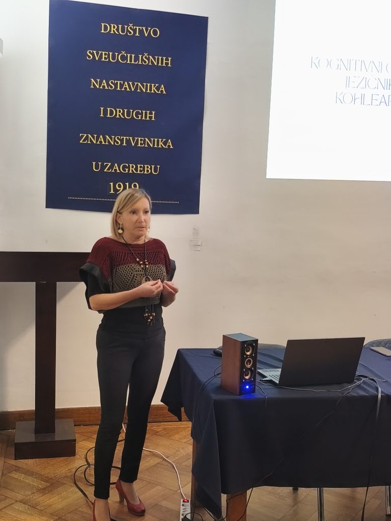 U srijedu 29. listopada 2025. u 19 h u prostorijama Društva održano je izlaganje Kognitivni čimbenici varijabilnih jezičnih ishoda nakon kohlearne implantacije dr. sc. Ivane Šimić, asistentice na Odsjeku za logopediju Edukacijsko-rehabilitacijskog fakulteta Sveučilišta u Zagrebu. Predavanje je organizirano u suradnji s Odjelom za jezični razvoj Hrvatskog filološkog društva, a događanje je moderirala doc. dr. sc. Ana Matić Škorić.