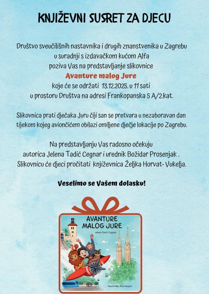 s veseljem pozivamo Vas, Vašu djecu, unuke i praunuke na predstavljanje slikovnice Avanture malog Jure autorice Jelene Tadić Cegnar. Ovaj književni susret za djecu održat će se u subotu 13. prosinca 2025. godine s početkom u 11 h u prostorijama Društva sveučilišnih nastavnika i drugih znanstvenika u Zagrebu (Frankopanska 5a/2. kat).