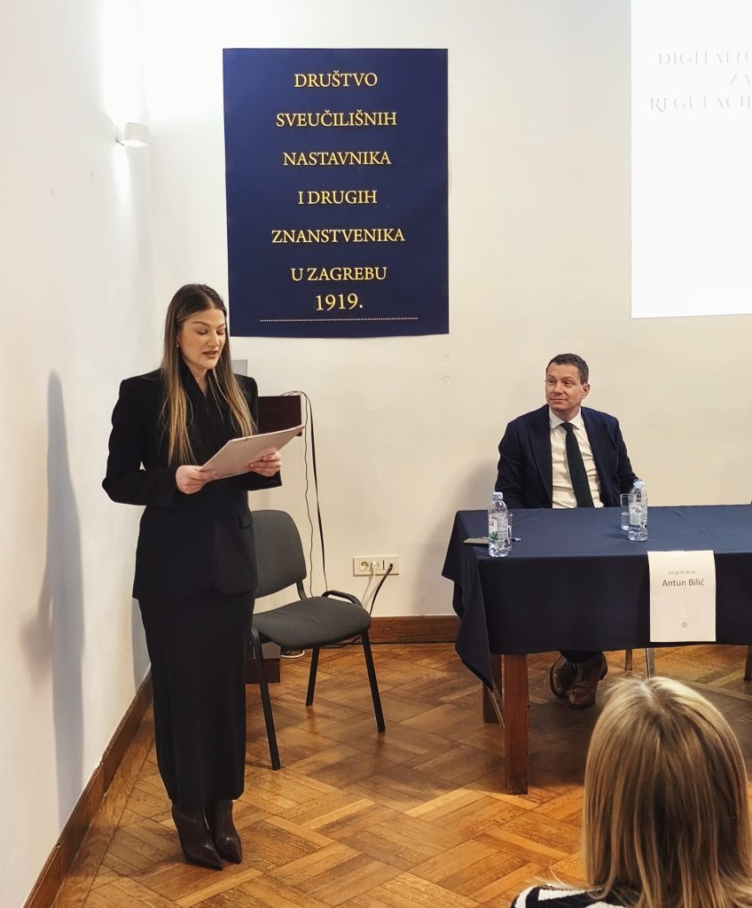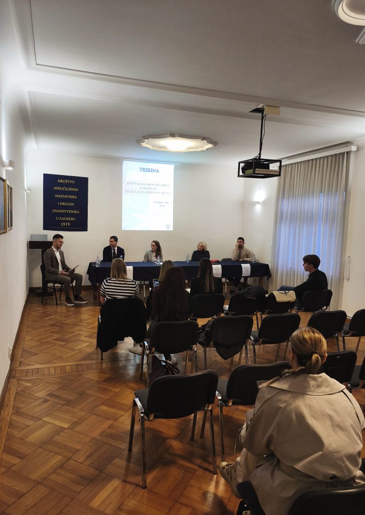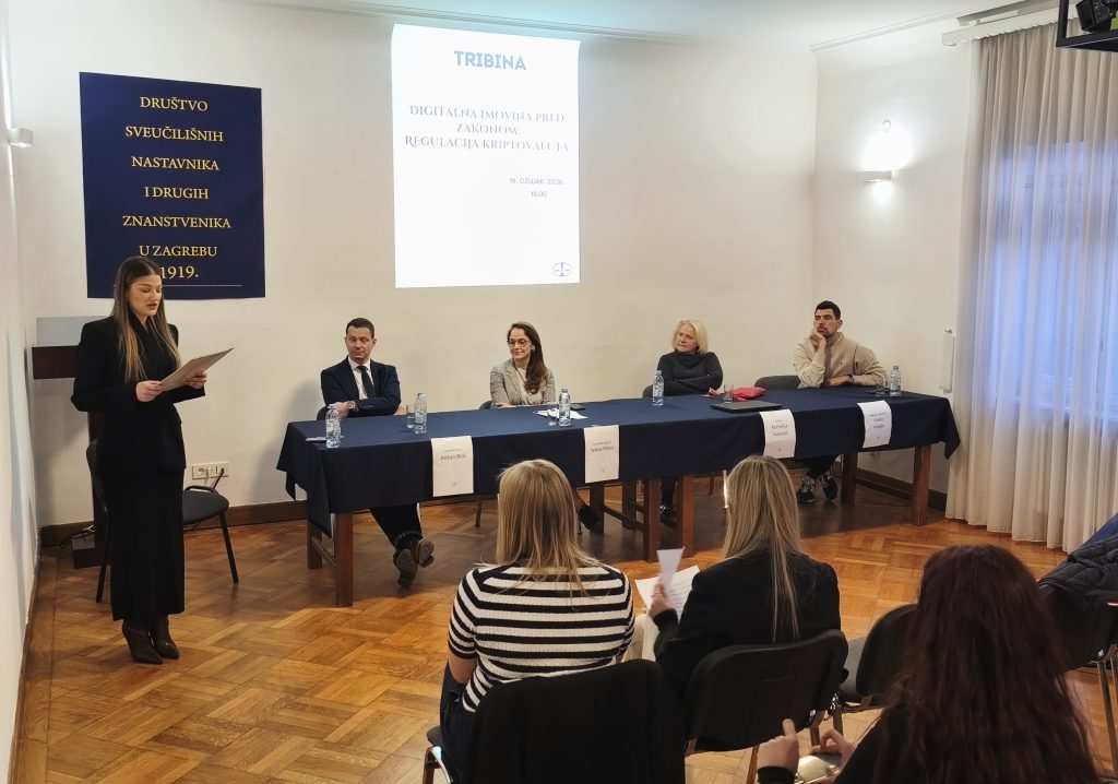 U četvrtak 19. ožujka 2026. godine u 18 h u prostorijama Društva održana je tribina Digitalna imovina pred zakonom: regulacija kriptovaluta. U raspravi su sudjelovali: izv. prof. dr. sc. Antun Bilić, univ. spec. Ivana Parać, dipl. iur., sutkinja Kornelija Ivanušić i odvjetnik Vlaho Hrdalo, mag. iur.