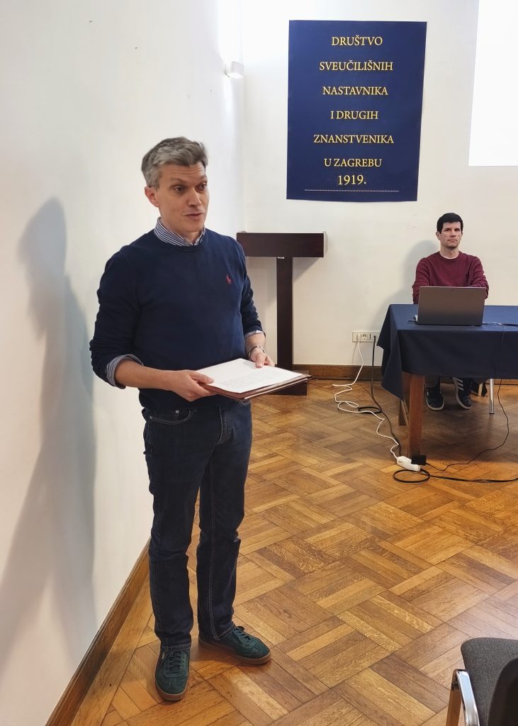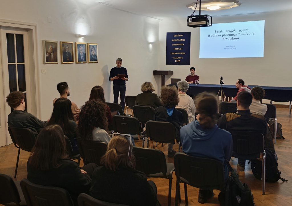U utorak 31. ožujka 2026. godine u 19,15 h u prostorijama Društva održano je izlaganje Vazda, vavijek, vazest: o odrazu početnoga *vъ- u hrvatskom dr. sc. Mate Kapovića, redovitog profesora s Odsjeka za lingvistiku Filozofskog fakulteta Sveučilišta u Zagrebu. Predavanje, održano u suradnji sa Zagrebačkim lingvističkim krugom, moderirao je Hrvoje Kovač, asist.