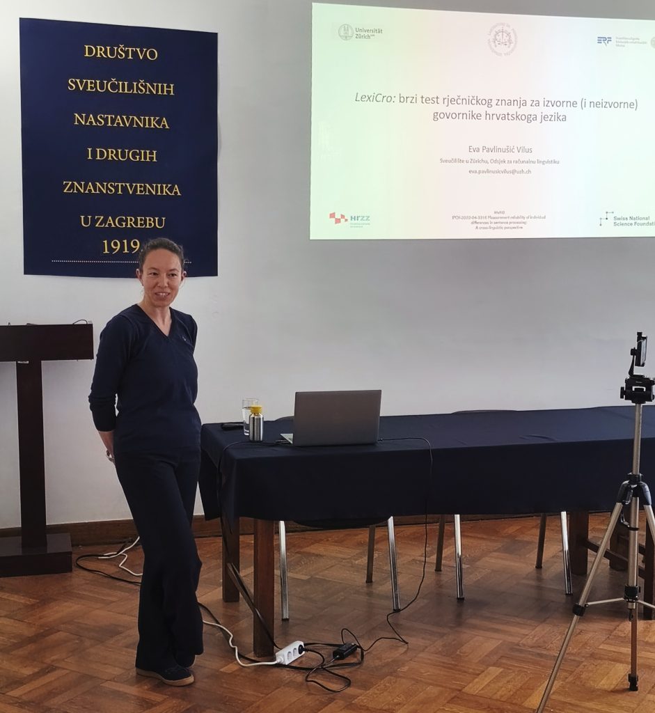 U četvrtak 16. travnja 2026. u 19 h u prostorijama Društva održano je izlaganje LexiCro: brzi test rječničkog znanja za izvorne (i neizvorne) govornike hrvatskoga jezika dr. sc. Eve Pavlinušić Vilus, više asistentice s Odsjeka za računalnu lingvistiku Sveučilišta u Zürichu. Predavanje je organizirano u suradnji s Odjelom za jezični razvoj Hrvatskog filološkog društva, a događanje je moderirala doc. dr. sc. Ana Matić Škorić.